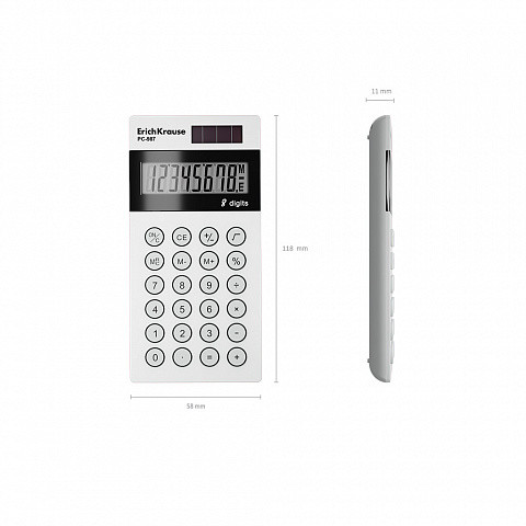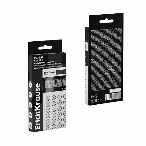 Marca: ErichKrause Colore: Bianco Modello: DC-987 Classic Display: 8 cifre LCD Cover: Inclusa in PVC Alimentazione: solare + batteria alcalina | Spegnimento automatico Dimensioni Corpo: 120 × 59 mm