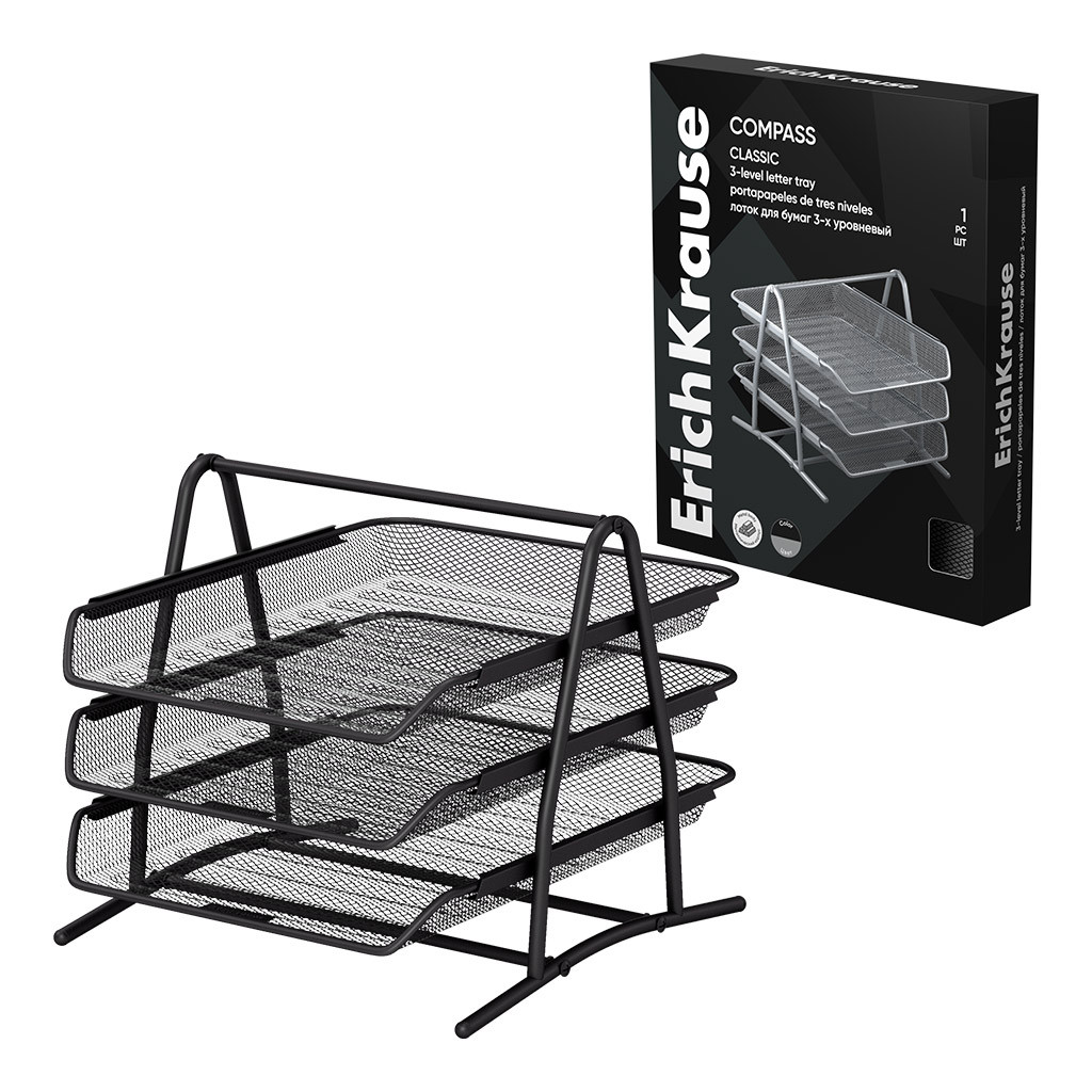 Questo utile vassoio portadocumenti di ErichKrause modello Compass Classic ti permette di organizzare gli spazi della tua scrivania in modo rapido, efficiente e in poco ingombro. i 3 ripiani di acciaio nero assicurano tanto spazio di archiviazione per documenti, listini e riviste in poco ingombro, facendo di questo vassoio un oggetto resistente e dal design moderno ed elegante. Questo portadocumenti è equipaggiato con un meccanismo a binario per un accesso facile e veloci ai tuoi documenti archiviati. Il prodotto è inscatolato, venduto e spedito in confezioni singole che lo proteggono dagli urti. Realizzato in rete metallica mesh verniciata nera che ne assicura la resistenza agli urti e la leggerezza per favorirne la comodità d'uso.